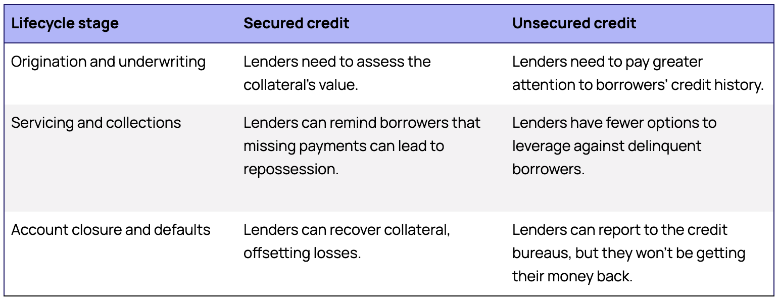 While some credit providers only offer secured products, others offer them alongside unsecured options, often using secured credit as a stepping stone to unsecured products. As borrowers demonstrate responsible payment behavior and improve their credit profiles, they then become candidates for unsecured credit as part of a credit lifecycle journey.
